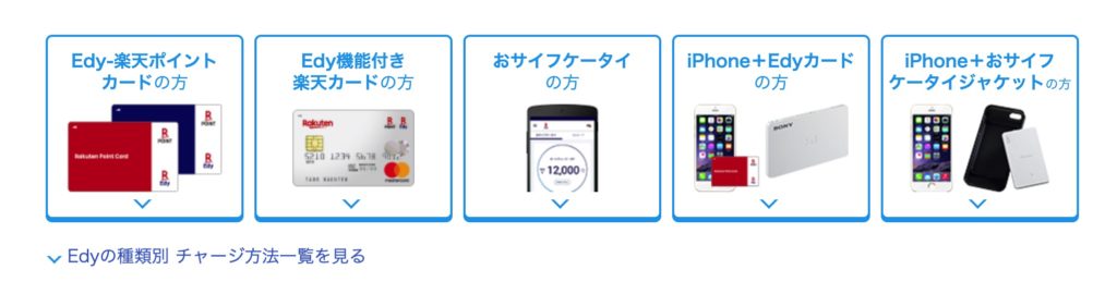 オートチャージができる楽天Edyの種類は下記のとおりです。