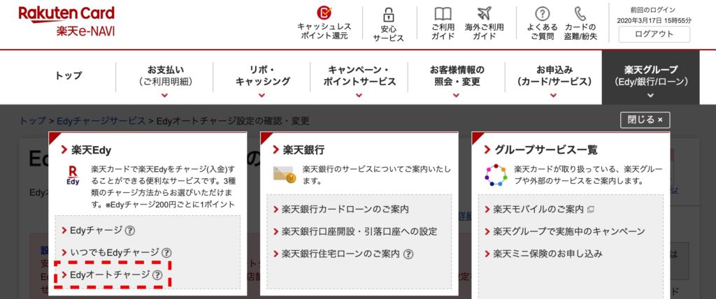 楽天Edy機能付きの楽天カードのオートチャージ設定は、楽天カード会員の専用サイトである楽天e-NAVIでおこなうことができます。