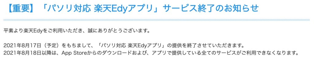 ただし、このパソリ対応の楽天Edyアプリは2021年にサービスが終了することが決まっています。