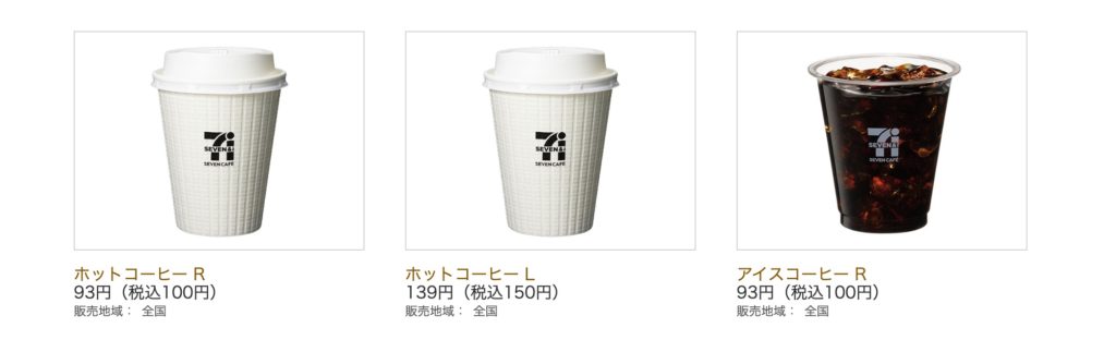 セブンイレブン、ローソン、ファミリーマートなどでは、コーヒーのSサイズが100円(税込)です。