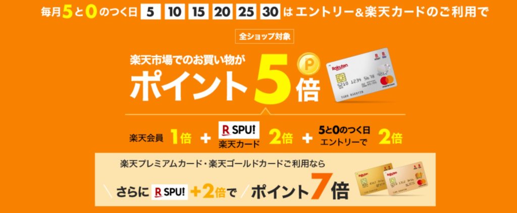 楽天カード会員がエントリーすることで利用できるキャンペーンで、毎月5日・10日・15日・20日・25日・30日はポイントが+2倍になります。
