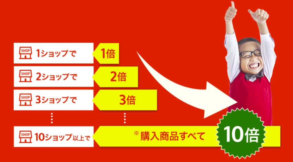 お買い物マラソン中は、楽天市場で利用したショップの数に応じてポイント倍率がアップしていき、最大+9倍(+9.0%)になります。