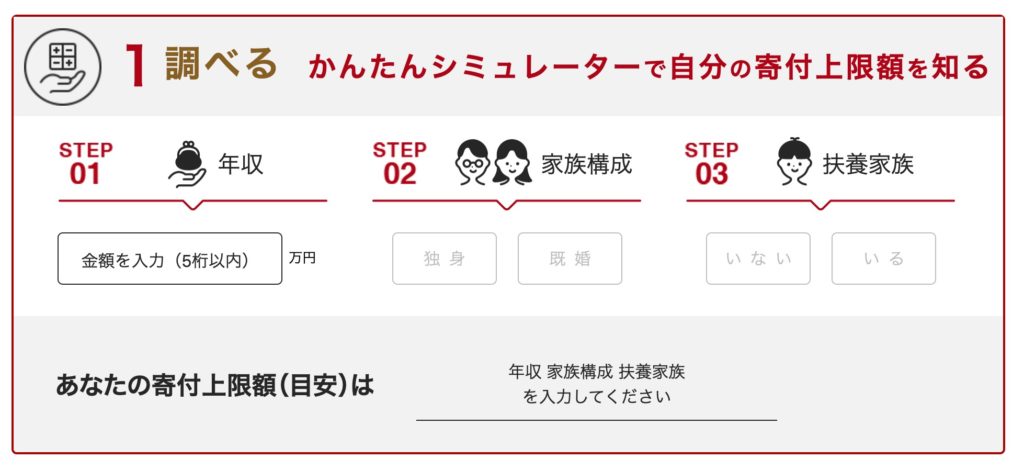 の3つの項目を入力することで適正な寄付額を瞬時に割出してくれます。