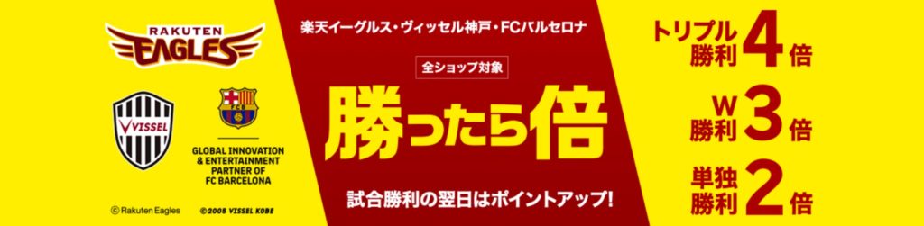 これらのサッカー、野球チームが勝利した日の0時から24時間、楽天会員はキャンペーンにエントリーすることでポイントが2~4倍になります。