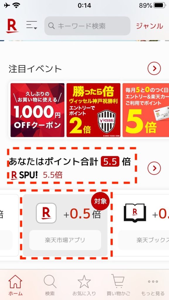 たとえば楽天市場のスマホアプリからお買い物すると、それだけで条件達成になりポイント倍率が+0.5倍されます。