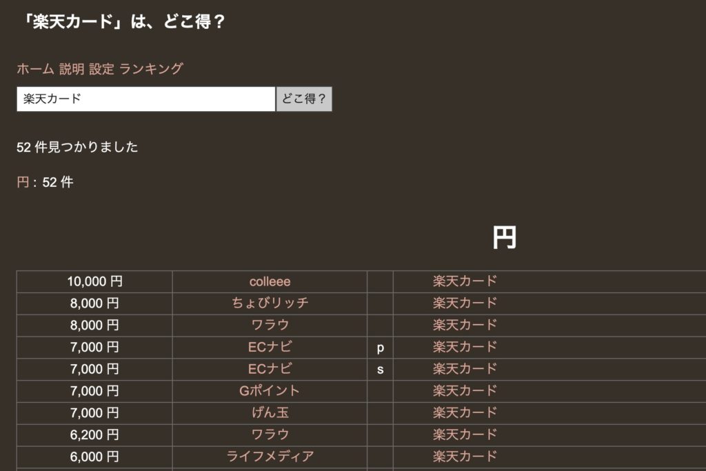 非常にシンプルなサイトで、検索窓に調べたい案件を入力すると、現在開催中の一番お得なポイントサイトから順に表示されます。