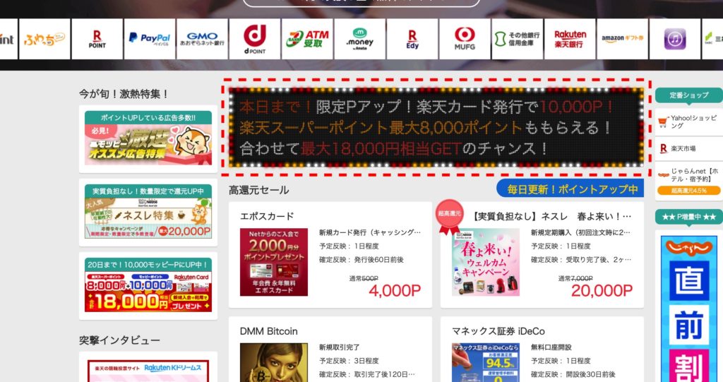 後ほど詳しく解説しますが、たとえば『モッピー』というポイントサイトでは2020年2月現在、楽天カードの申し込みで10,000円相当のポイントがもらえます。