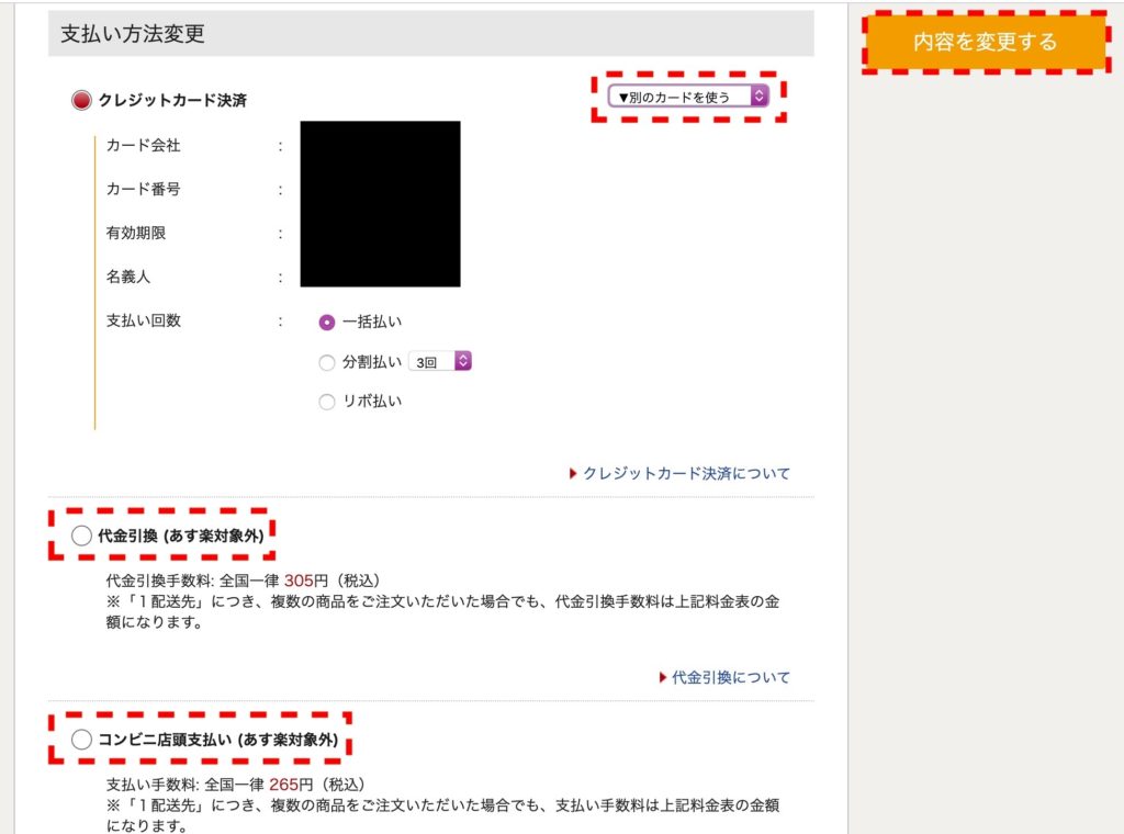 その他、代金引換やコンビニ店頭支払いなどで支払いたい場合は選択したあとに「内容を変更する」をクリックします。