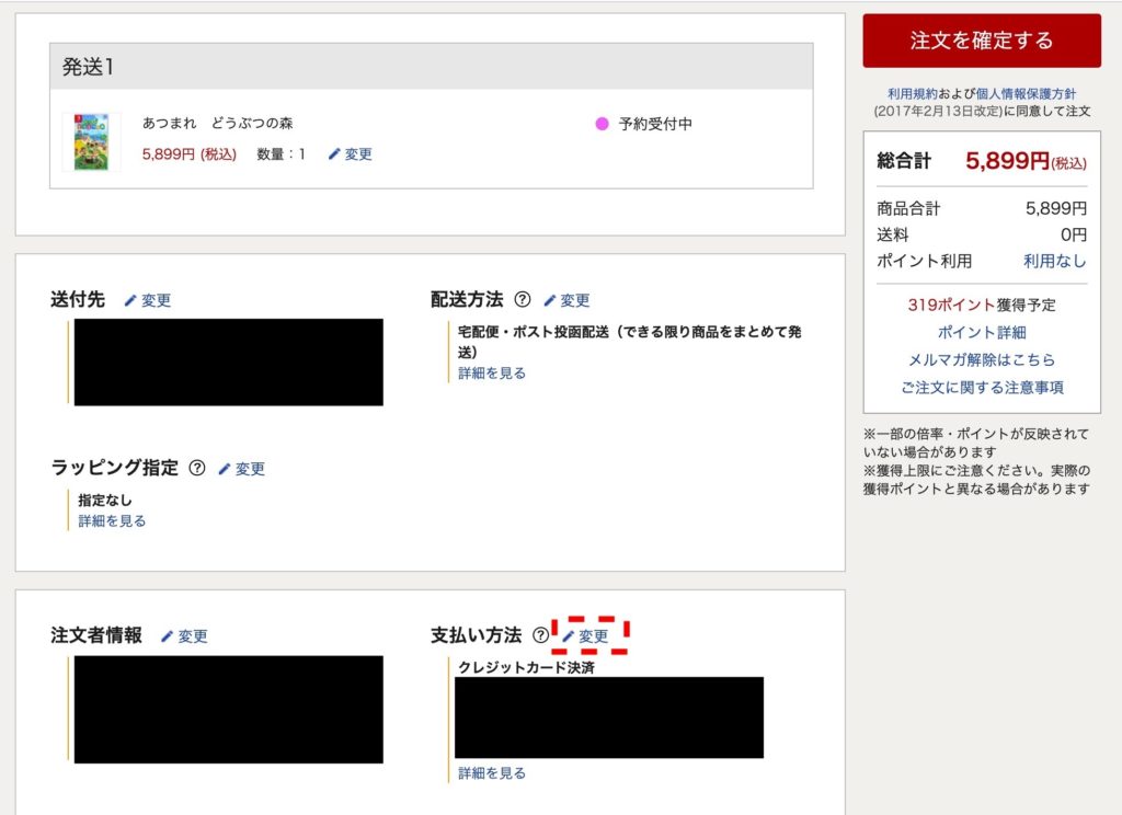 step4.支払い方法を選択し「内容を変更する」をクリック後に注文確定