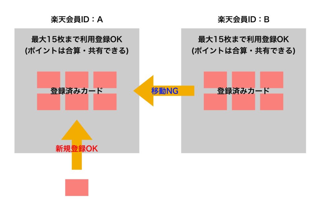 ただし、すでに今現在別の楽天会員IDで利用登録しているカードを別の楽天会員IDに利用登録し直すことはできません。