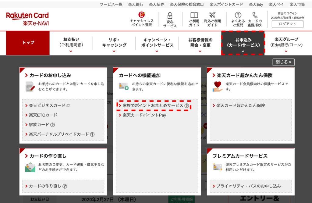 実際の『家族でポイントおまとめサービス』の場所は楽天e-NAVIの『お申込み(カード/サービス)』という場所にあります。