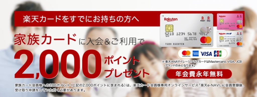 年会費無料の楽天カードであれば家族カードは無料で発行できますし、キャンペーンで2,000ポイントもゲットできます。