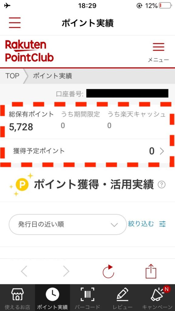 『獲得予定ポイント』『総保有ポイント』はアプリの画面を紹介すると下記の赤線で囲った部分です。