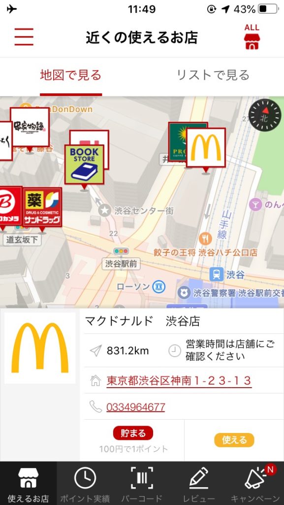 アイコンが表示されて、タップするとそのお店でゲットできるポイントや、ポイントが使えるかどうか、お店までの距離などが確認できてかなり便利です!