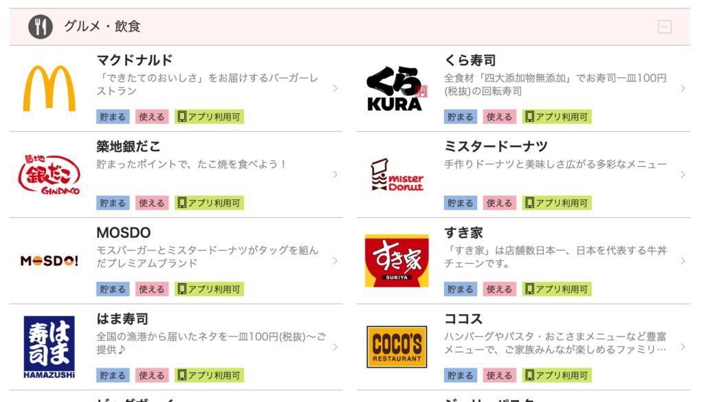 注意点としては「ポイントを貯められるけど、使えないお店」がある点です。