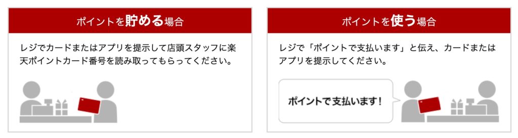 楽天ポイントカードの場合はポイントが使えるお店でお店で「ポイントで払います」と伝えてカードを出すだけでOK。