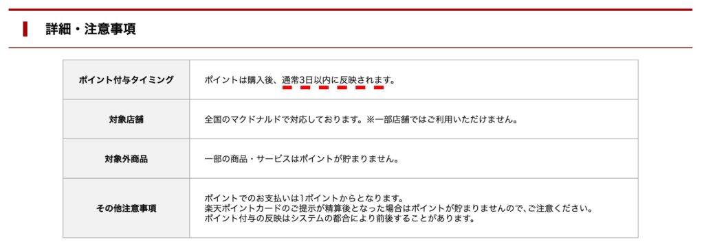 一例としてマクドナルドを見てみると下記のように「通常3日以内に反映されます」と記載されています。