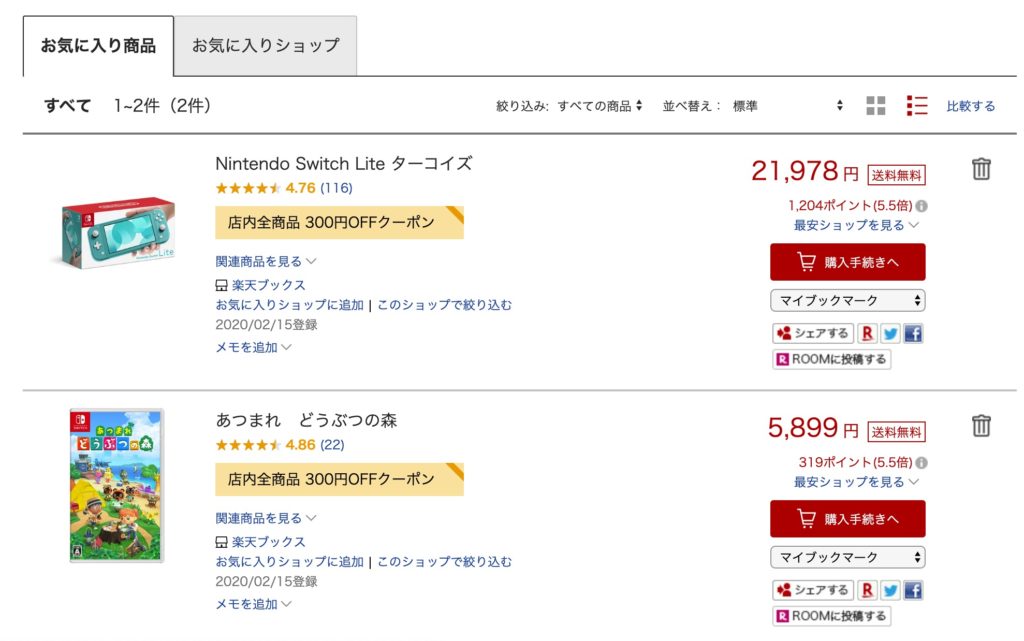 お気に入り登録した商品は下記のように一覧としてみることができ管理することができます。
