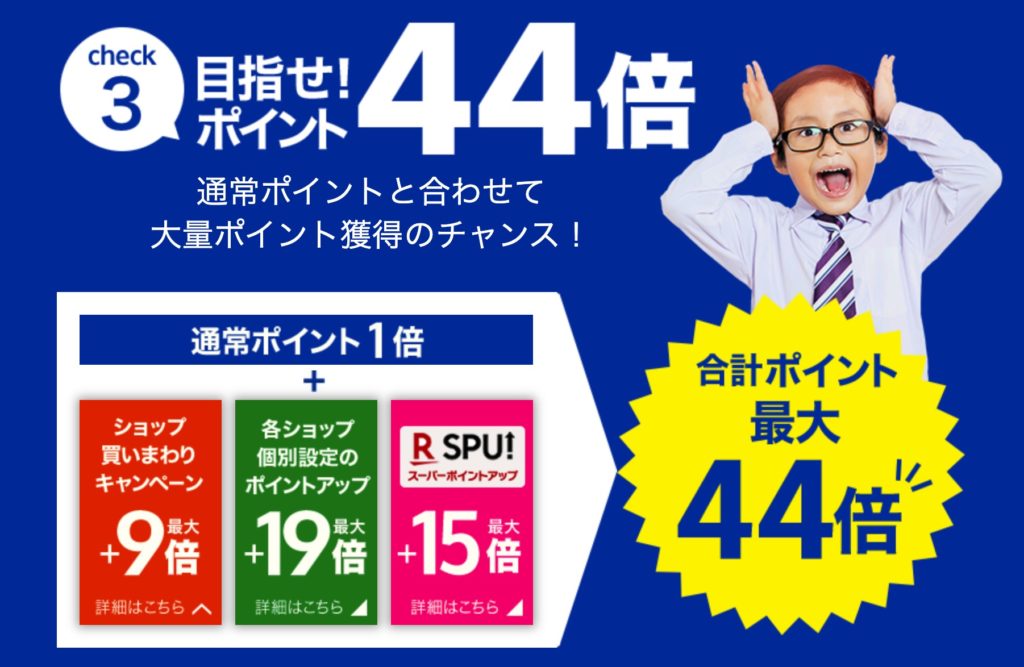 | SPU(スーパーポイントアッププログラム) | 楽天カードの利用や楽天アプリの利用など条件クリアで最大ポイント+15倍 |