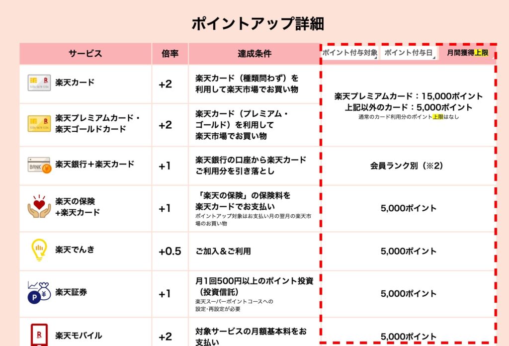 | SPU(スーパーポイントアッププログラム) | 各条件ごとに上限が異なります。 ※会員ランクによっても異なる場合あり |