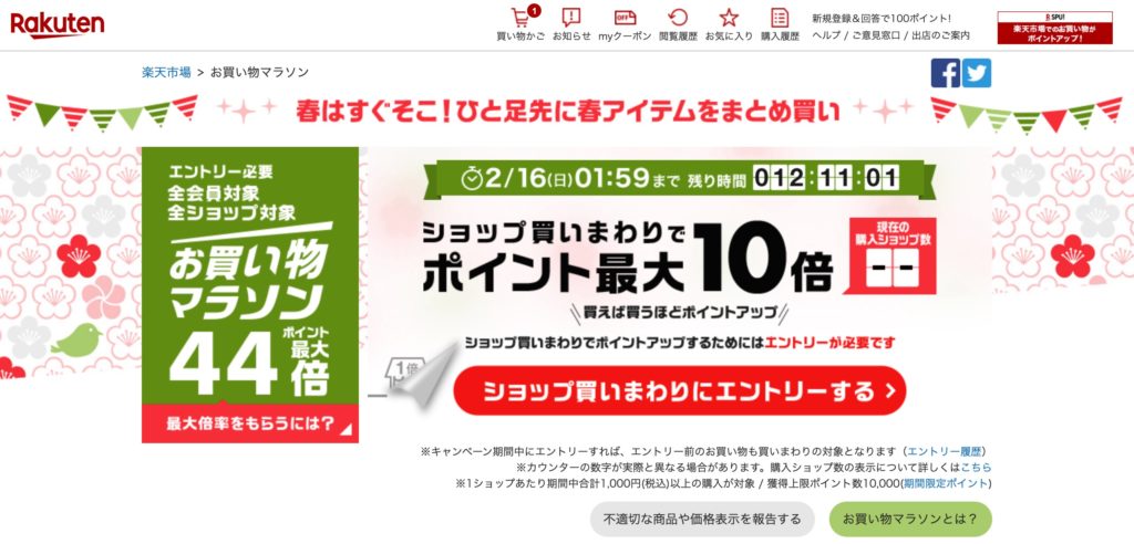 今回のショップ買い回りキャンペーンは2月16日に終了ですが、次回の『楽天スーパーセール』は3月4日からのセールスタートが予想されています。