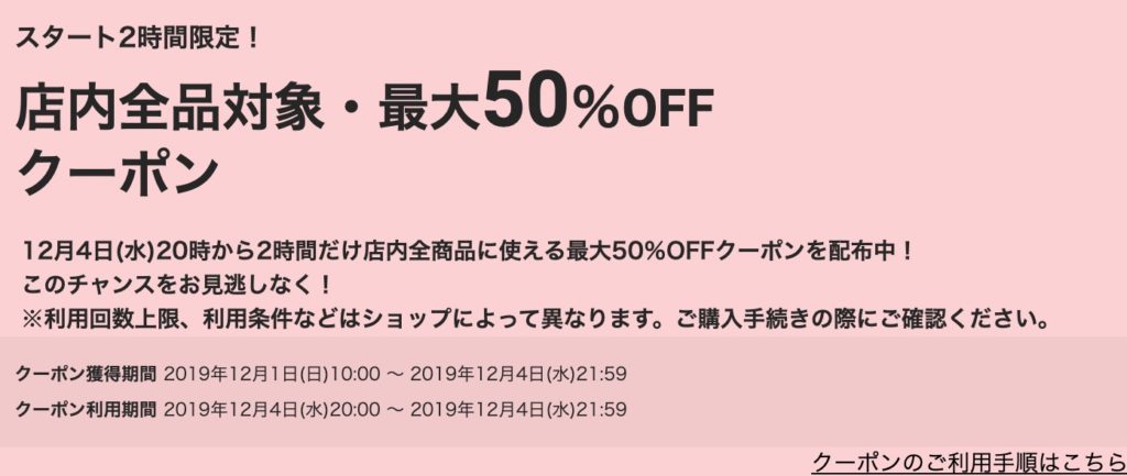 その他にもショップで商品が50%OFFになるクーポンの配布なども行われます。
