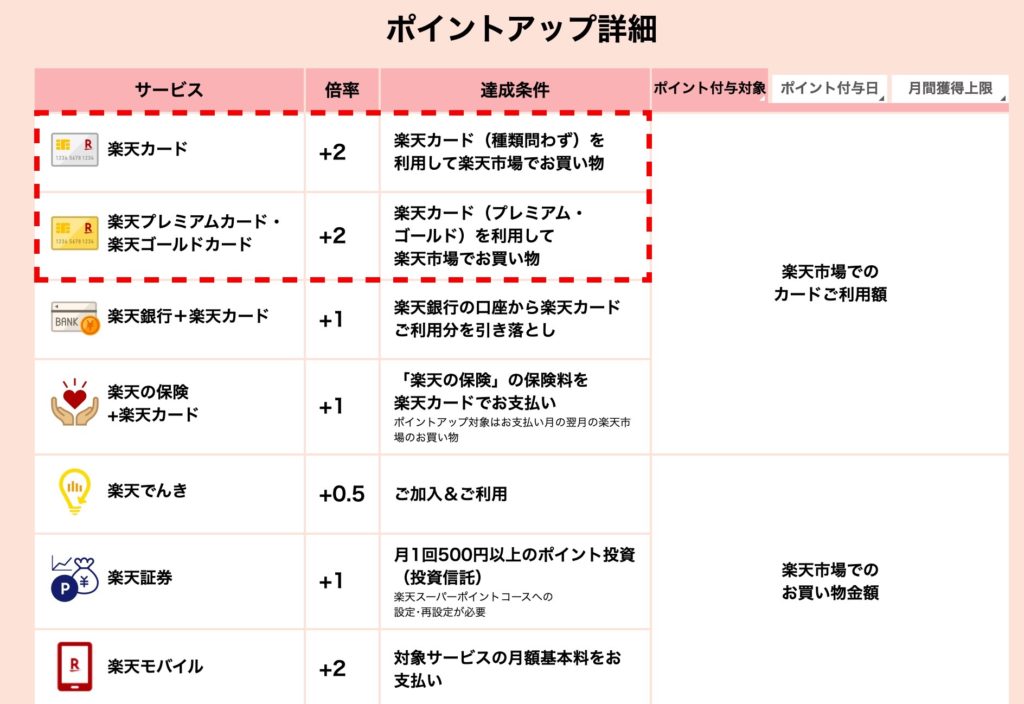 楽天カードは+2倍と表示されていますが、内訳は楽天カード利用ボーナスポイント1.0%、カード決済ポイント1.0%で+2倍です。