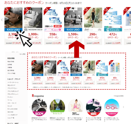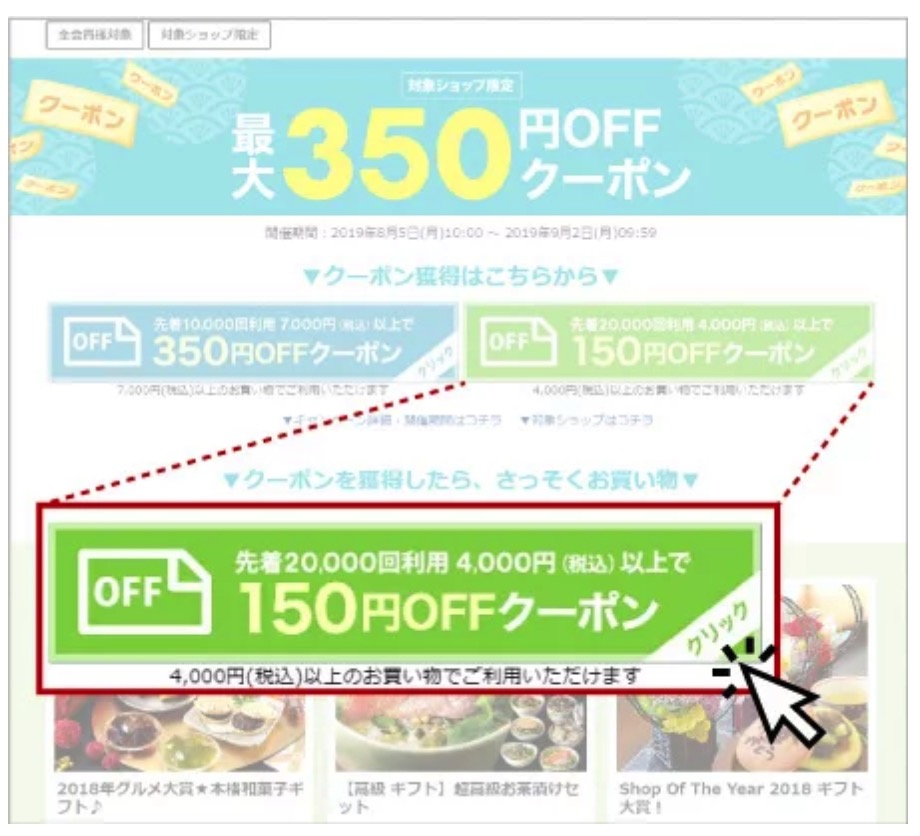 ページ上でバナーをクリックするとクーポン獲得画面に移行してクーポンをゲットできます。