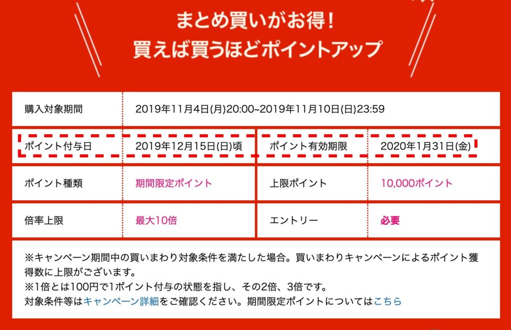 下記のように2019年11月に行われたセールの場合、ポイント付与日は12月15日、有効期限は1月31日です。