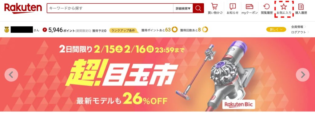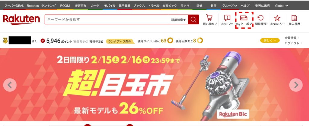 楽天市場のトップページから『myクーポン』をクリックすると、自分に最適化されたクーポンページに行くことができます。